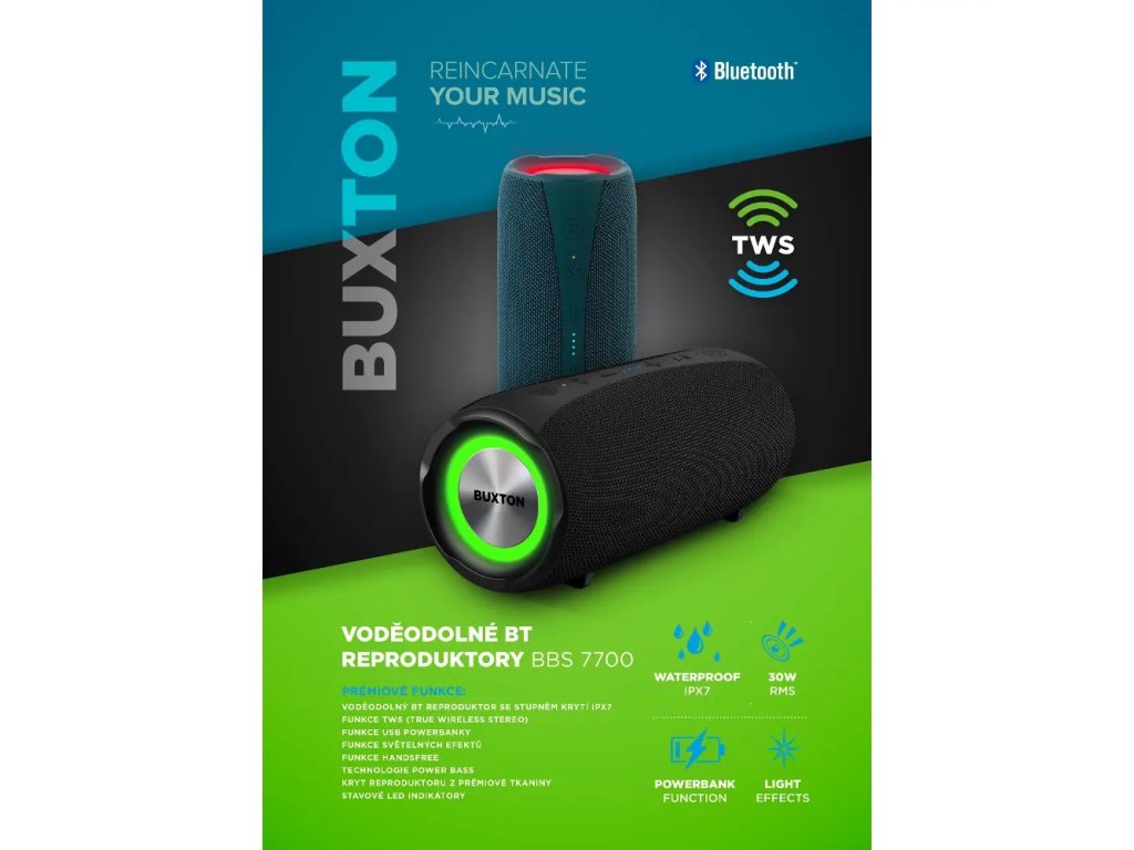 Voděodolný BT reproduktor se stupněm krytí IPX7, funkce TWS (True Wireless Stereo), funkce handsfree, technologie Power Bass, Maximální výkon 50 W, Funkce světelných efektů