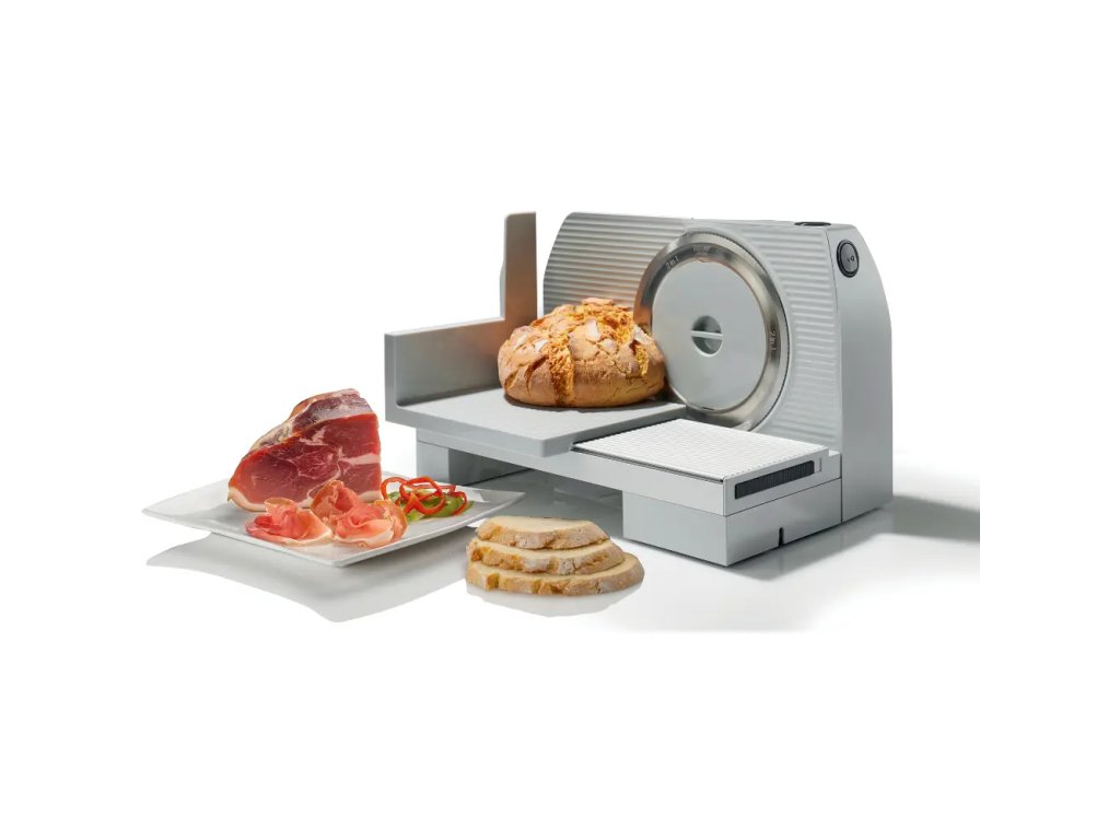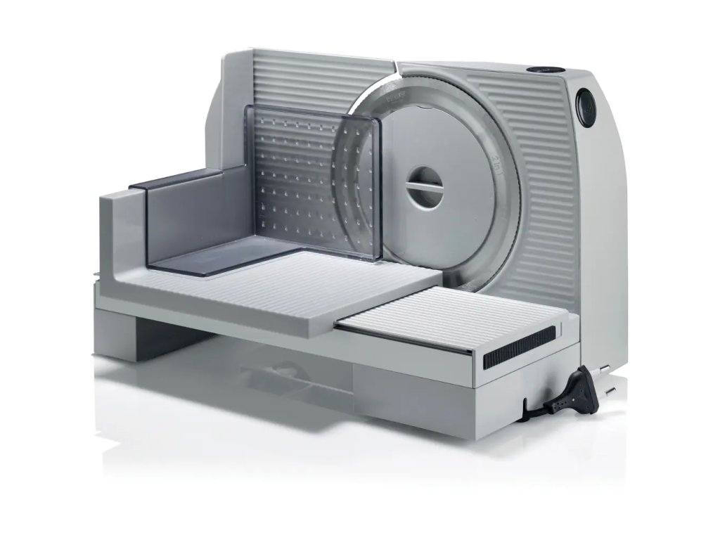 Elektrický kráječ, příkon 100 W, vhodný pro domácí použití, bezpečnostní pojistka, odnímatelný kotouč, Solingen kotouč z nerezové ocele, průměr kotouče 17 cm, tloušťka řezu 0-15 mm, bezpečnostní pojistka, šedá