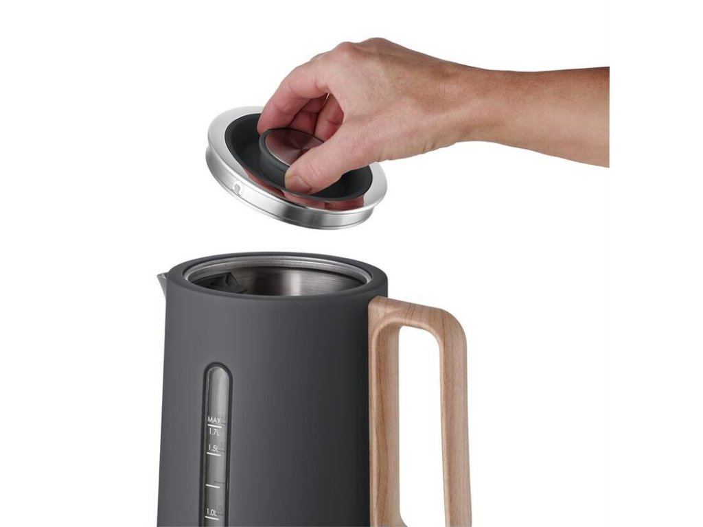 Rychlovarná konvice je vybavena velkým plnicím otvorem a přehledným vodoznakem pro okamžitý přehled o množství vody uvnitř. Vyjímatelný filtr proti usazeninám zajišťuje, že uvařená voda bude vždy čistá a bez nežádoucích částic, což přispívá k lepší chuti vašich nápojů. Skryté topné těleso dosahuje rychlého a rovnoměrného ohřívání vody, zatímco kontrolka provozu vás informuje o stavu ohřevu. Díky plně otočnému středovému konektoru je konvice snadno přístupná z jakéhokoli úhlu, což usnadňuje manipulaci. Prostor pro uskladnění síťového kabelu v podstavci pomáhá udržet vaši kuchyň uklizenou a organizovanou.