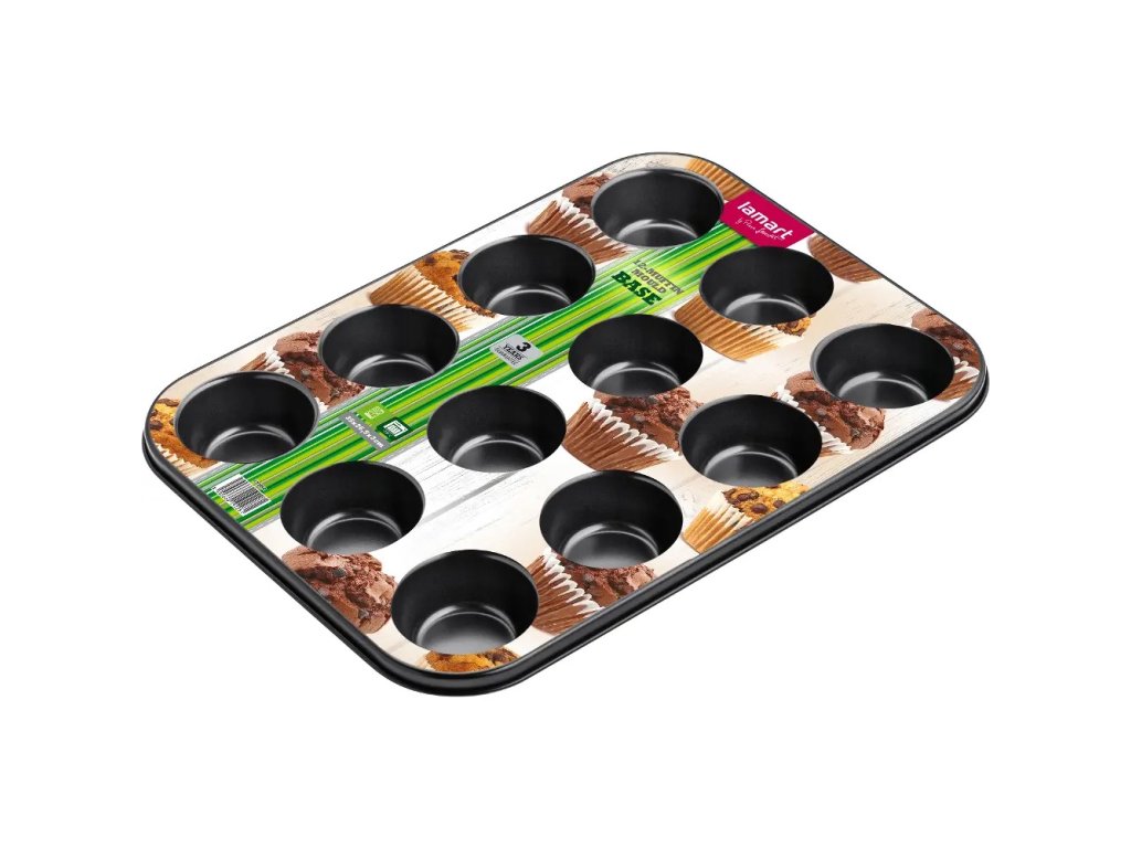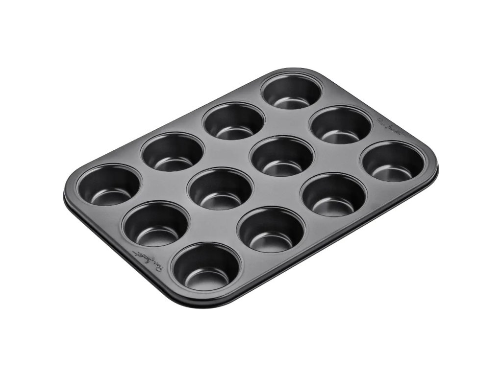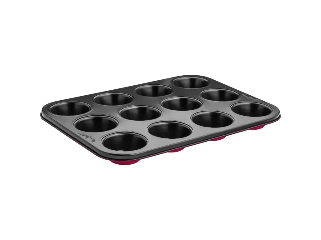 Forma na muffiny, velmi lehká, jednoduchá manipulace, vyrobeno z uhlíkové oceli, odolnost vůči vysokým teplotním rozdílům -60°C až 230°C beze změn vlastností, rozměry 35 x 26 x 3 cm, na 12 muffinů