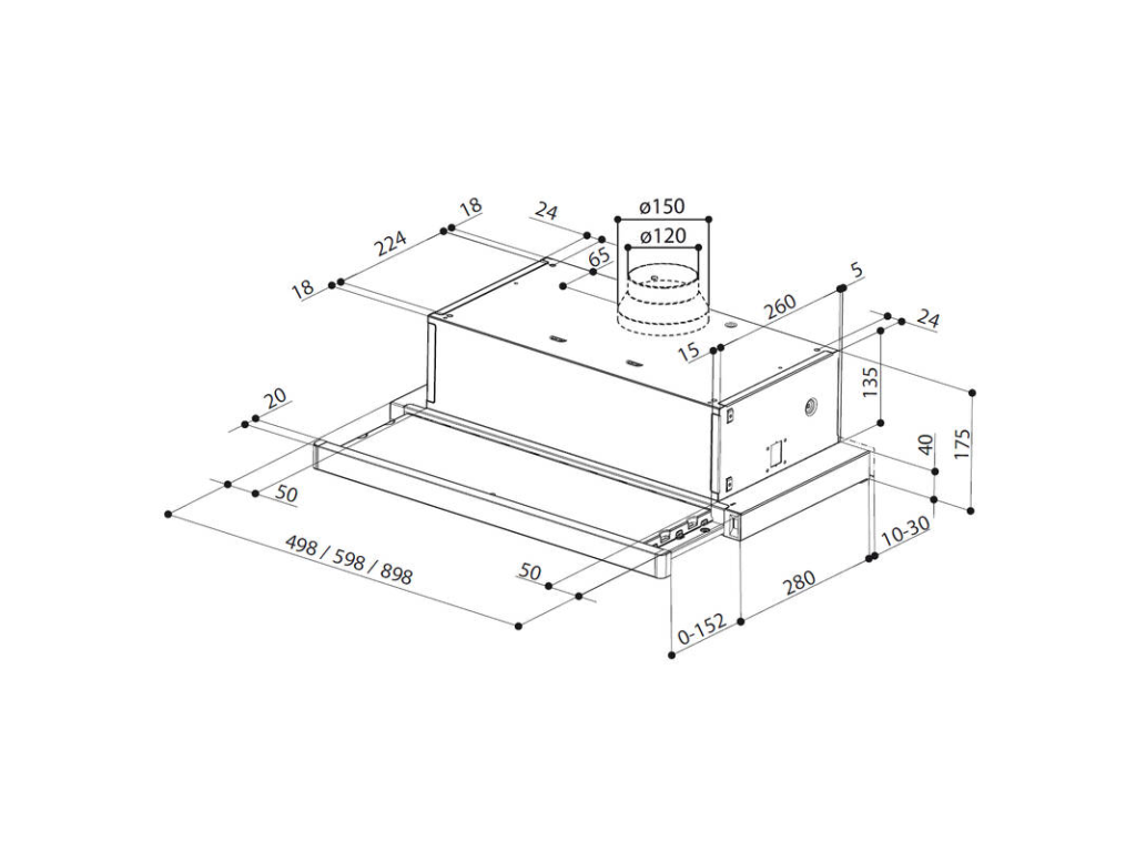 - Výsuvná část se aktivně podílí na odsávání par, digestoř spustí odsávání v předem nastaveném režimu ve chvíli, kdy vysunete přední část do prostoru. Zasunutím lišty se automaticky deaktivuje.