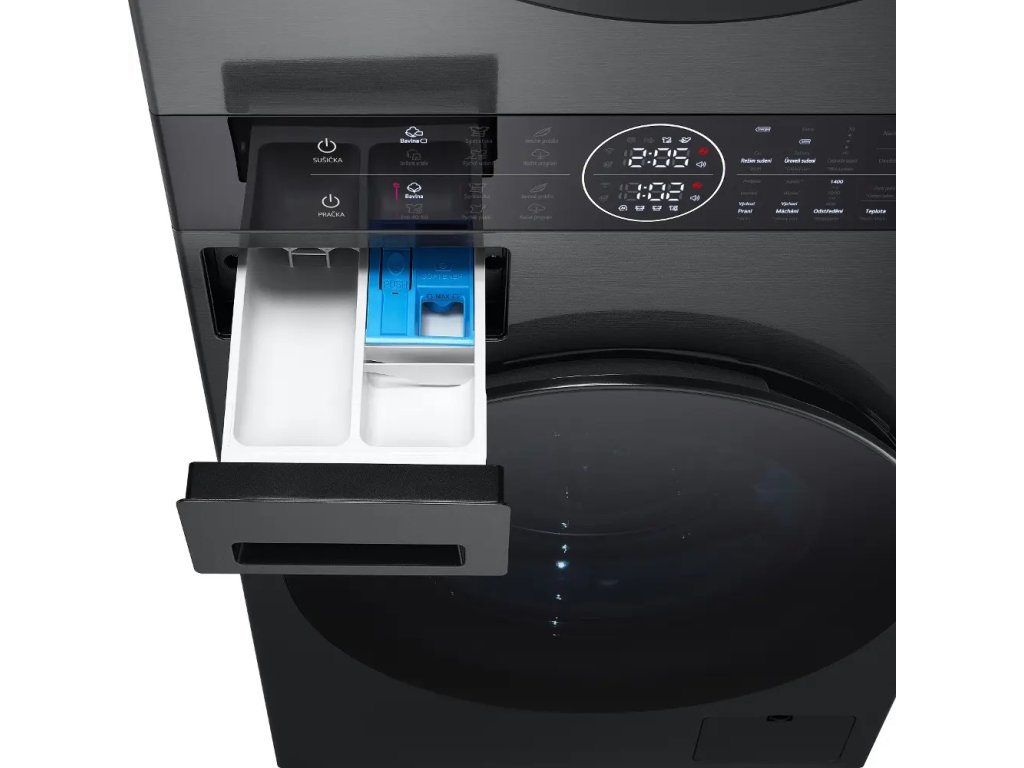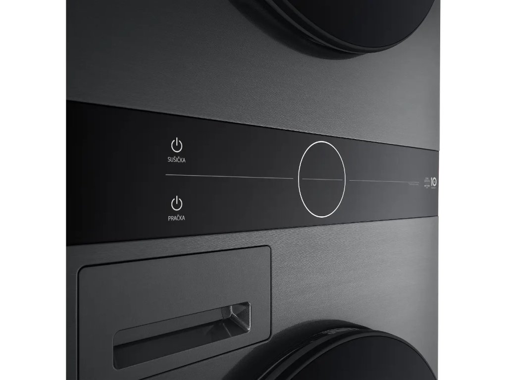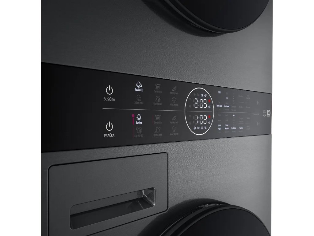 Snadné a pohodlné ovládání pračky se sušičkou LG WT1210BB má na starost středový panel. Pomocí aplikace LG ThinQ a podpory Wi-Fi připojení je umožněno nastavování i na dálku. Navíc tak získáte přístup ke stahování nových pracích cyklů. Spolehnout se můžete i na funkci hlasového asistenta, odložený start nebo dětský zámek.
